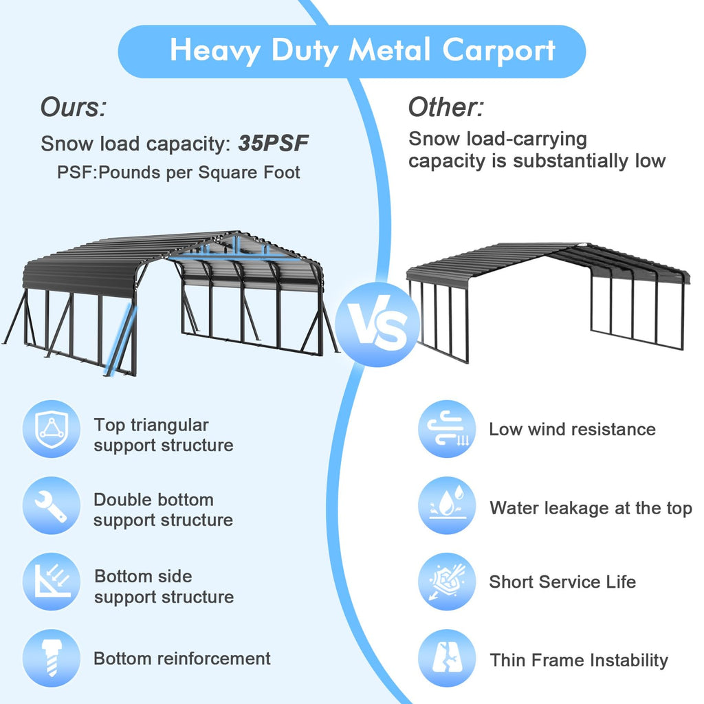 - Superior All-Weather Protection: This carport is expertly engineered with heavy-duty galvanized steel frame and reinforced roof structure to withstand extreme weather conditions including high winds, heavy snowfall, and intense UV exposure. The carport's triple-layer galvanized frame and anti-rust coating deliver unmatched protection for coastal/humid areas