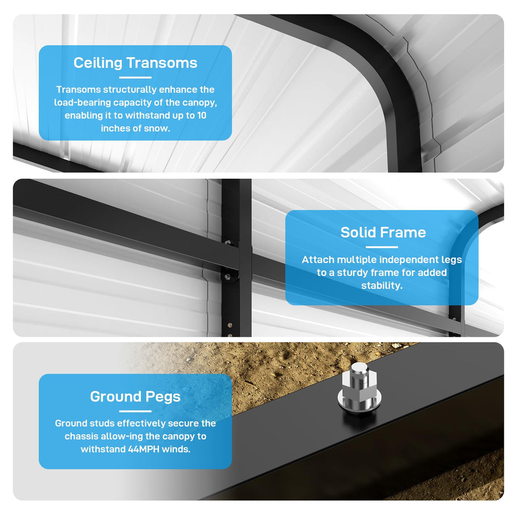 - Spacious and Stable Shelter Shade: Providing a large 13'W x 16'D x 8.4'H size. Featuring a comfortable eave height of 102 inches, there's ample clearance for various vehicles. Equipped with 10 anchor bolts for enhanced stability. The thoughtful water drainage design with triangular sloped tapes prevents rainwater buildup. Supported by steel poles and transoms, this carport is built to withstand harsh weather conditions, ensuring long-lasting stability and performance.