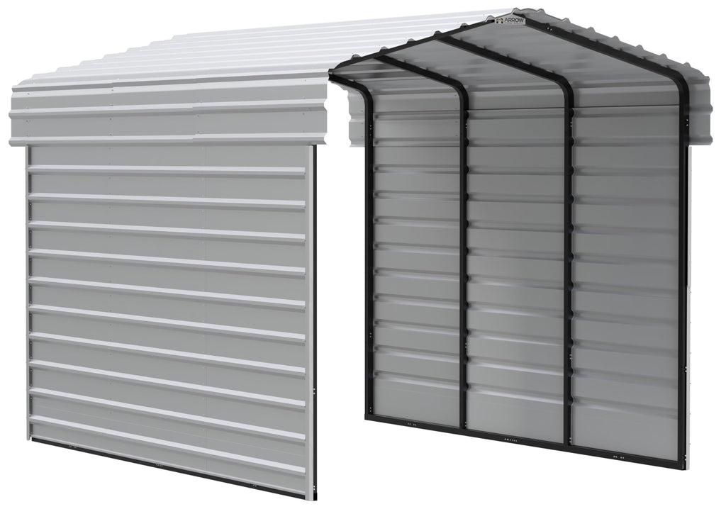 Details: Protect your property with this galvanized steel carport with 2-sided enclosure from Arrow! This durable, all-steel carport comes in a variety of sizes to protect all of your vehicles, outdoor equipment and more from those hot sun rays. Made with a heavy-duty galvanized steel roof and all-steel, premium powder coated tube frame, this carport is both snow and wind rated, making it ideal for keeping your expensive equipment out of the elements. The included 2-sided enclosure can be attached to the carport to provide extra protection from the elements.With two neutral color options, a wide array of sizes, and easy installation, Arrow protective carports are perfect for vehicles, boats, tractors, outdoor picnic areas and much more.