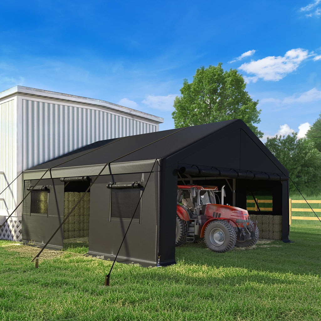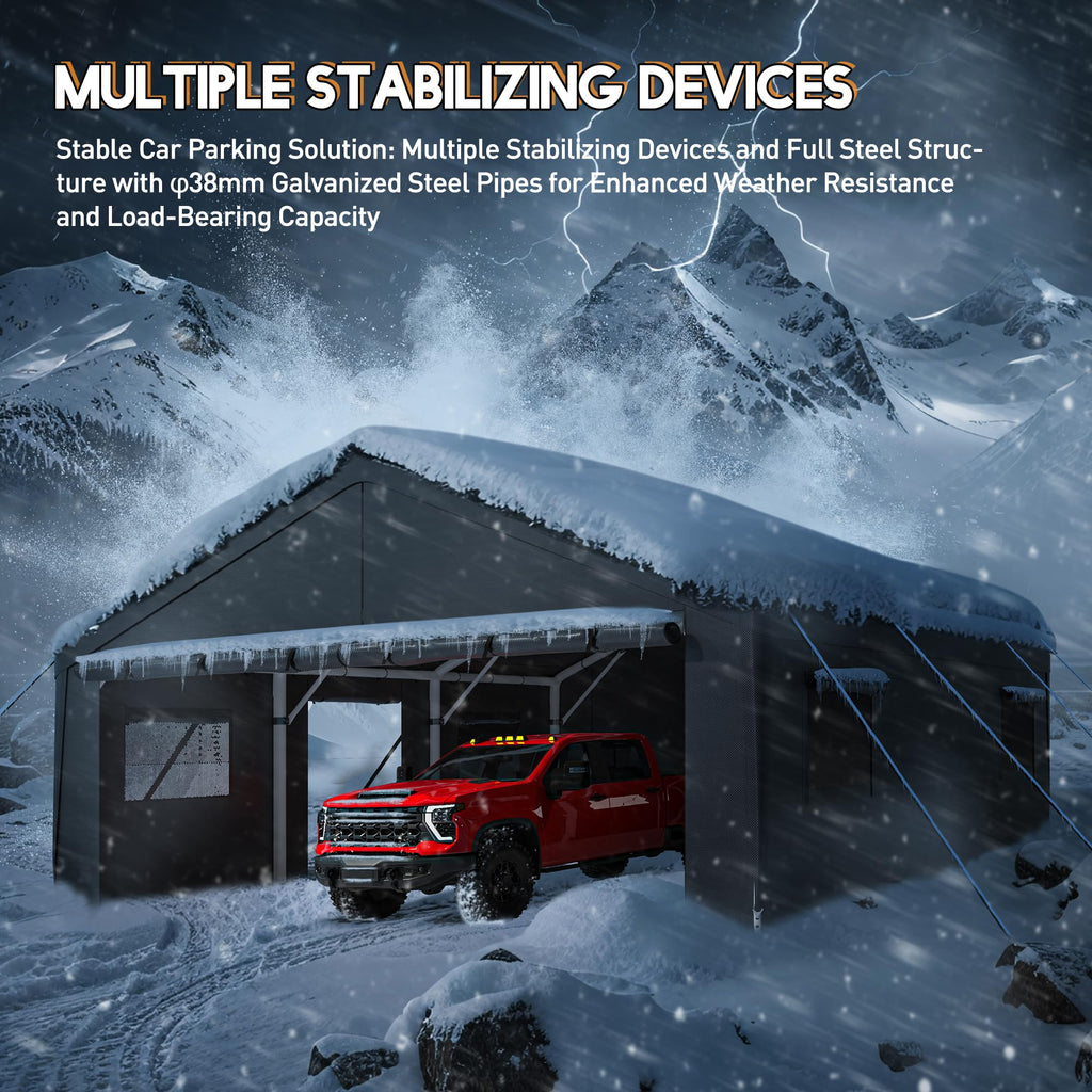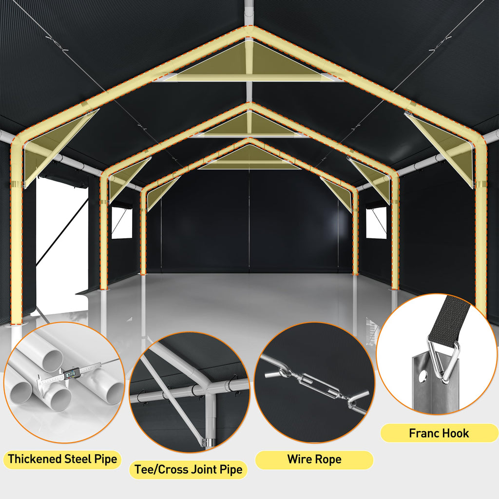 - 【Multi-Functional Space】Adaptable side walls and modular door/window layouts let you customize this carport for diverse needs: 2 cars carport, create a workshop, or use it as a party tent. Its spacious design supports both vehicle protection and outdoor gatherings seamlessly.