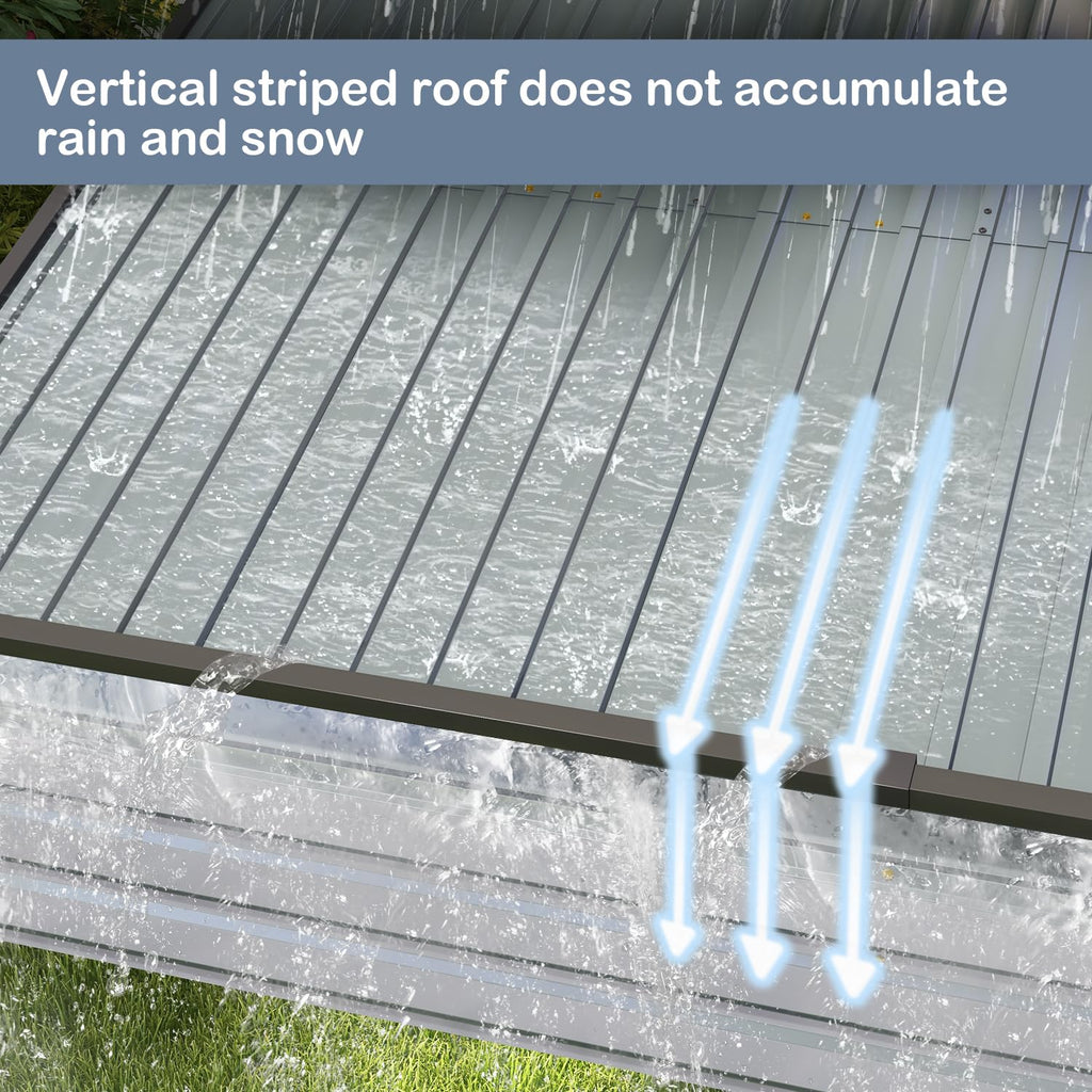 - UNQUE VERTICAL STRIPE ROOF: COEWSKE has improved and upgraded the regular horizontal stripe carport on the market, the roof adopts vertical stripe with inclined grooves, the rain and snow will not accumulate on the roof, it will flow down naturally with gravity, and it can face the torrential rain and blizzard weather directly. High winds can also be blown away directly along the grooves, which enhances the wind resistance of the carport by reducing the force area and friction.
