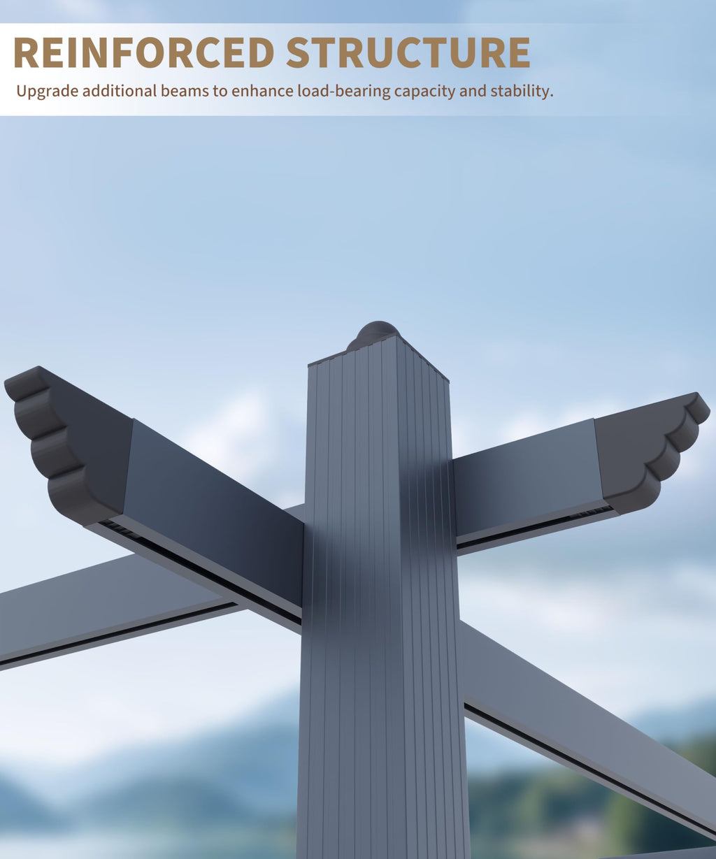 - 【Versatile & Multi-Functional Design】Our Aluminum Pergola isn’t just shade—it’s your all-in-one outdoor oasis. Whether hosting weekend barbecues, cozy family dinners, or relaxed afternoon gatherings, this pergola transforms your space into a stylish and practical retreat. Its sleek, adaptable design blends effortlessly with any backyard aesthetic while maximizing functionality, so you can dine, entertain, or unwind in perfect comfort