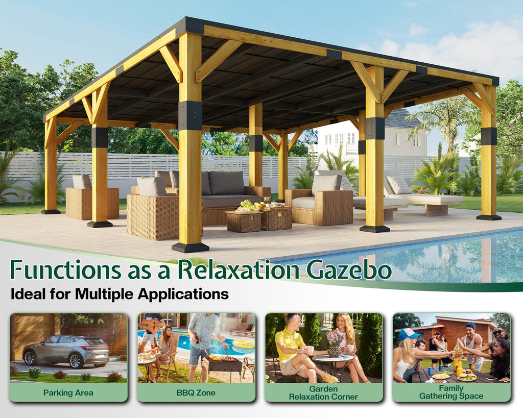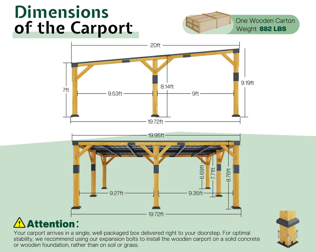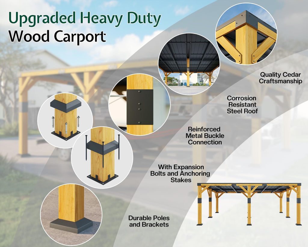 - Built for Extreme Weather Conditions: Constructed with a rust-resistant galvanized steel sloped roof and solid cedar wood frame, this wooden carport withstands winds up to 100 mph and supports 20,800 lbs—delivering year-round protection in all climates