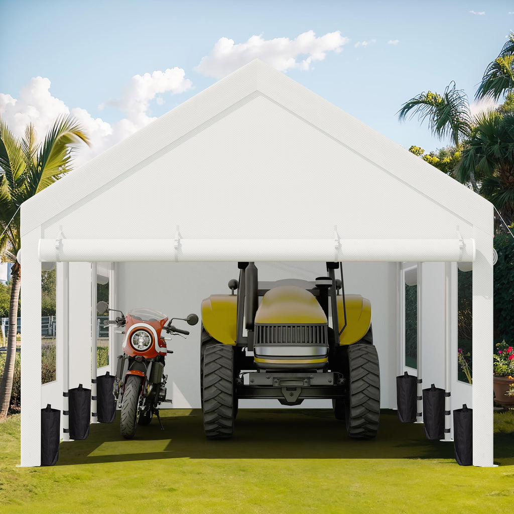 JY QAQA Carport, 12x20 FT Heavy Duty Carport with Removable Side Walls and Doors, Portable Garage with Roll-Up Window and Sandbags, Car Canopy with All-Season Tarp for Cars, Trucks, Boats, White
