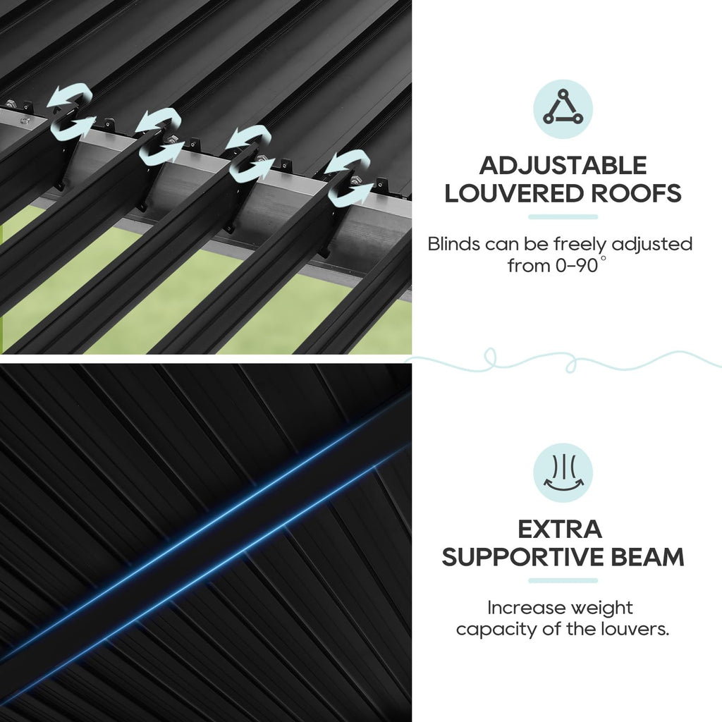 - 【Adjustable Louvered Roof】Enjoy ultimate control over sunlight and shade with our outdoor pergola's independent adjustable louvers, ranging from 0° to 90° effortlessly. This feature not only provides shade but also shelters you from rain when fully closed, ensuring year-round comfort.