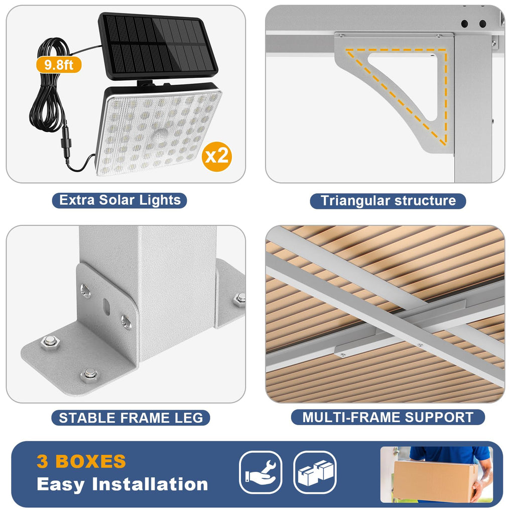 • 【EXTRA SOLAR LIGHTS & STURDY FRAME】The wall-mounted gazebo features durable powder-coated aluminum for strong support and resistance to fading, rust, and corrosion. Pergola with pre-drilled feet and ground stakes for added stability, awnings for patio ensures secure and reliable use. The included solar light enhances ambiance and illumination for enjoyable outdoor evenings.