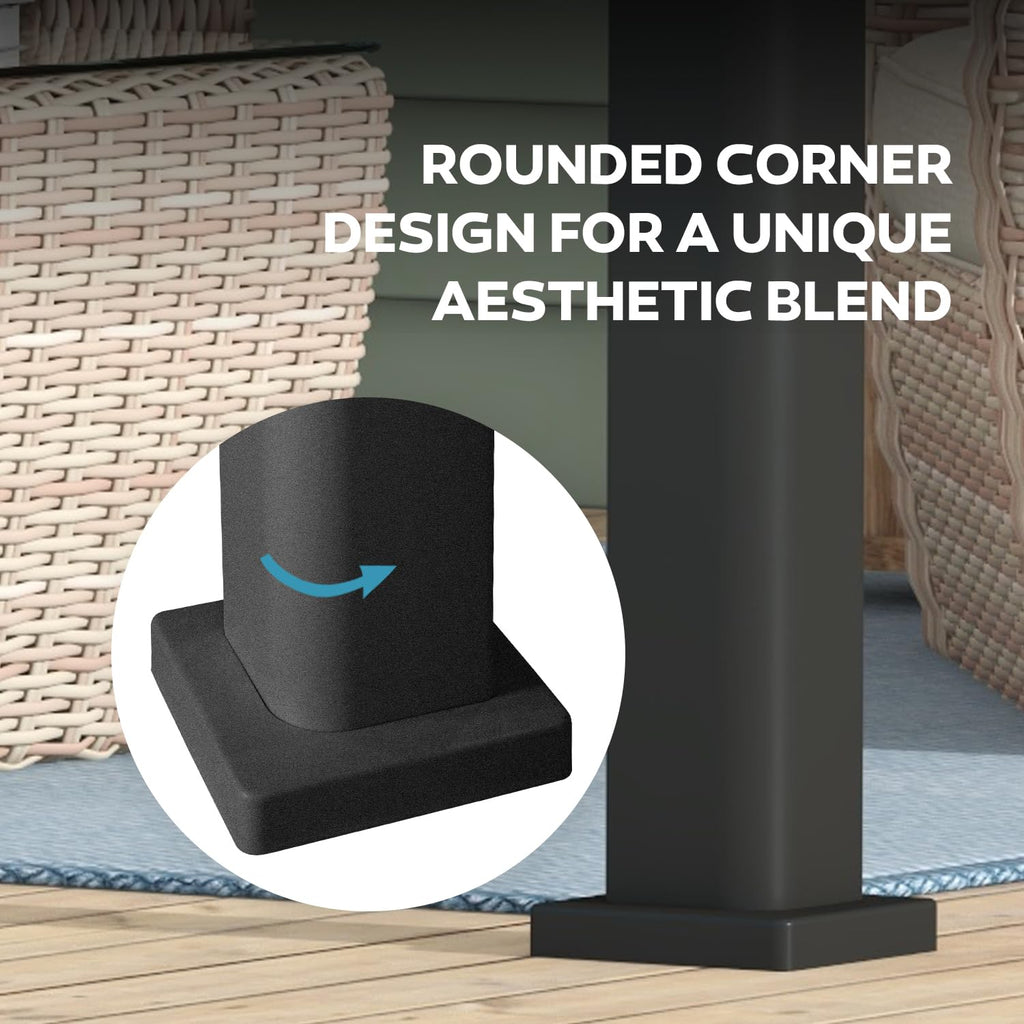 • Innovative Drainage System: Our patented Integrated Water Drainage feature is designed to efficiently channel rainwater to the columns and effectively drain it through the notches at the base of the rounded pillars, keeping your outdoor space clean and dry.