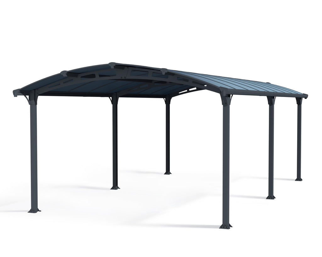 Presenting the Arcadia Carport from Palram - Canopia, a leader in outdoor shelter solutions. This carport kit is designed with a robust heavy-duty metal frame, providing a carports space with a heavy-duty polycarbonate roof, perfect for both car and RV storage. The Arcadia carport is backed by a 10-year warranty, providing peace of mind for your investment. The Arcadia 12' x 21' Carport/Patio Cover is designed to be installed easily by 2 people within a few hours and does not require building skills or special tools. The virtually unbreakable, 100% UV protected Bronze 6mm thick roof panels simply slide into place-no need to get on the roof to secure them. It comes with pre-drilled holes, pre-cut panels and included screws as well as an anchor kit for securing your carport. This stylish and durable shelter will protect your vehicle or outdoor recreation space from snow, rain, leaves and harmful UV rays. The sturdy, powder coated Bronze aluminum and galvanized steel frame is rust resistant, easy to clean with your garden hose, and has 30lbs/sq. ft. snow load with 50% margin of safety. The Arcadia has great features, including: two gutters, with downspout, to direct rain away from the sides, wide entry with high clearance and a great re-assembly option in case you need to change locations. A smart choice for your car or patio, the Arcadia can also be used as an outdoor kitchen, temporary gathering shelter or play area for children. The Arcadia metal carport garage from Canopia by Palram is more than just an aluminum carport, it's a commitment to quality, durability, and protection. So why wait? Secure your vehicles under this heavy-duty metal carport today and experience the peace of mind that comes with knowing your investment is protected. Specifications: - Carport: 12'x21'x6.5' - Frame: Metal & Aluminum - Roof: Polycarbonate panels - Protection: 100% UV - Use: Car & RV Storage - Assembly: DIY - Warranty: 10 years
