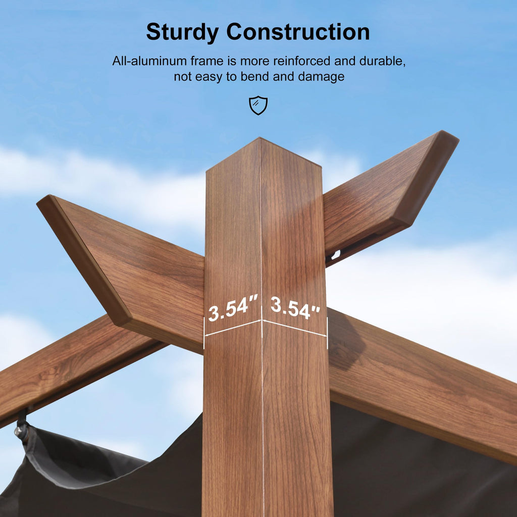 PURPLE LEAF 10' x 10' Outdoor Retractable Pergola with Sun Shade Canopy Patio Metal Shelter for Garden Porch Pavilion Natural Wood Grain Frame Aluminum Gazebo Modern Backyard Grill Pergola Gray