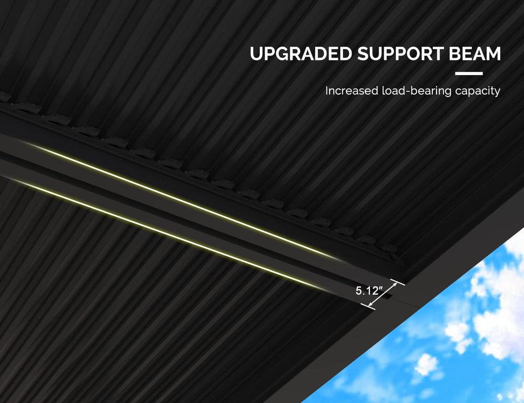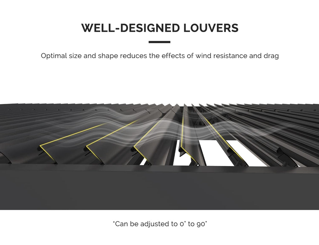 - Premium Material and Construction: This louvered pergola is made of a powder-coated aluminum frame which resists scratching, peeling, corrosion and rusting that will last for years of use. Can withstand wind speeds of 65 mph when fully secured by expansion screws on hardened floors.