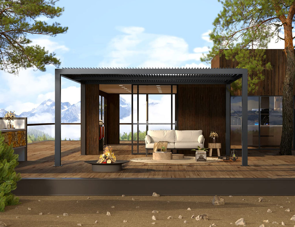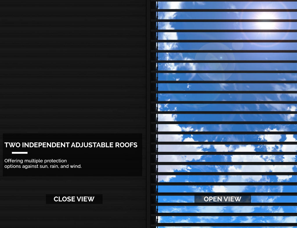 - Aluminum Adjustable Louvered Roof: Designed with two independent adjustable roofs, equipped with adjustable poles that allow you to adjust it effortlessly from 0° to 90°, offering multiple protection options against sun, rain, and wind.