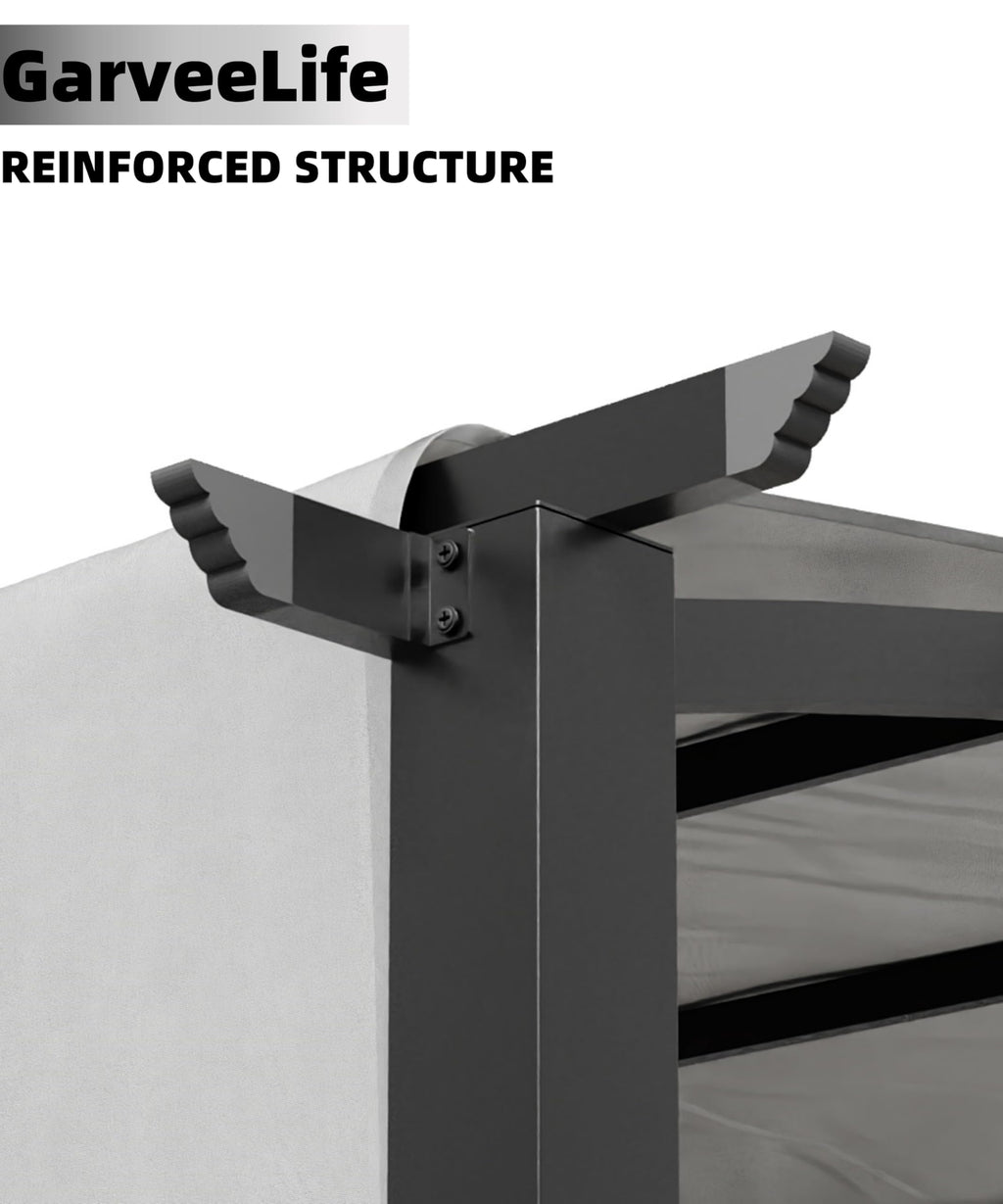 - 【Upgraded Base Columns】 This metal pergola with canopy has been upgraded for improved stability. Unlike ordinary base columns that only secure two sides, GarveeLife secures all four sides, ensuring that the entire structure won't wobble and maintains perfect stability, even in windy conditions.