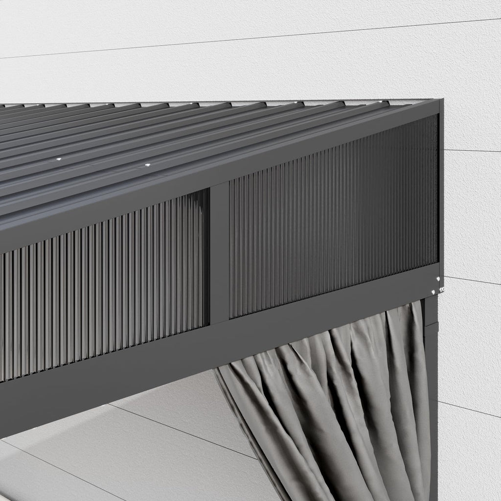 Details: Homsee 12x14 FT Wall Mounted Gazebo with Curtains & Netting, Hardtop Lean to Gazebo with Galvanized Iron Roof & Aluminum Frame, Outdoor Pergola for Patio, Deck, Backyard, Black