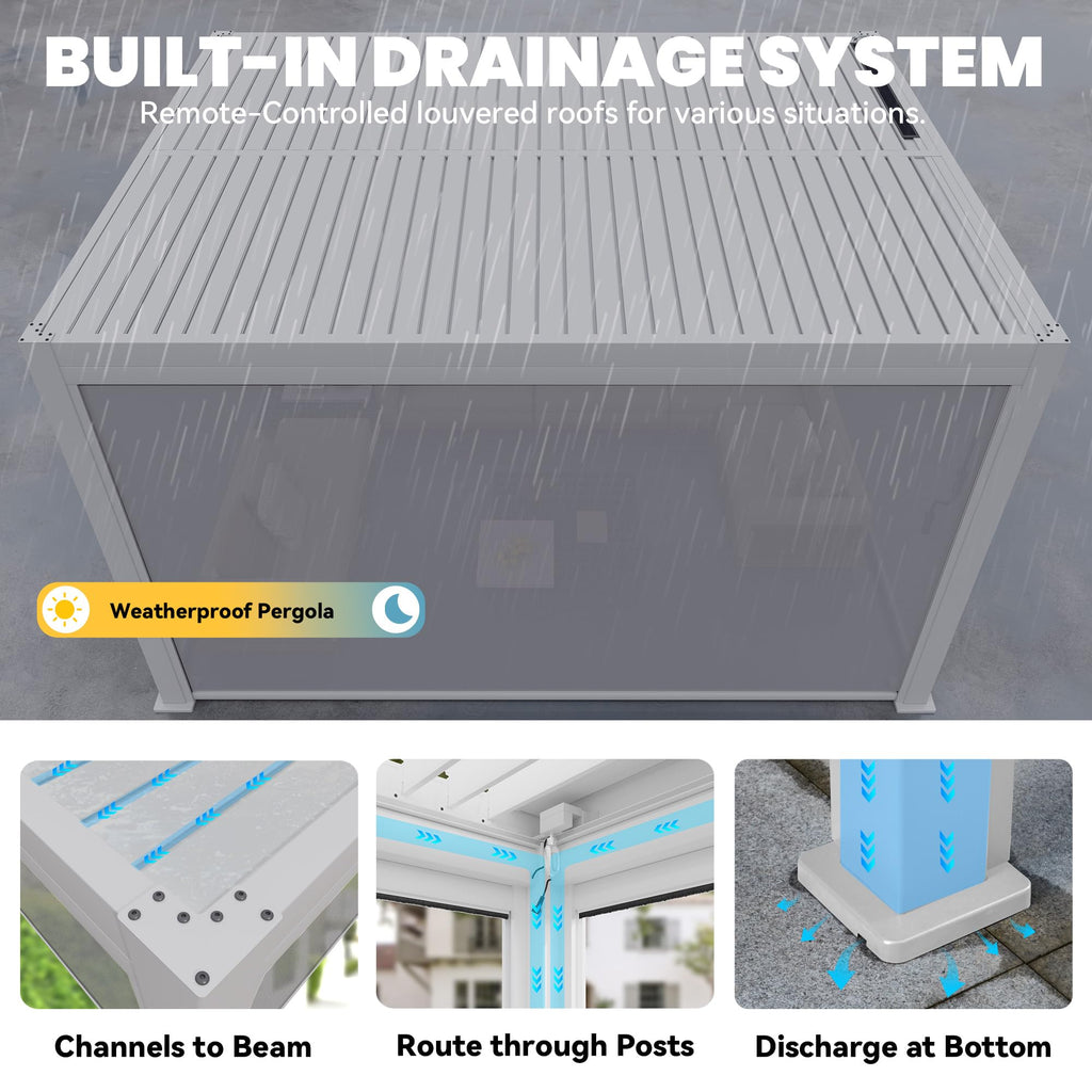 • DRAINAGE SYSTEM: The electric adjustable louvered roof allows precise control over sunlight and shade, providing 100% waterproof shelter. Rainwater flows into the gutter beams and drains through the legs, ensuring a dry, weatherproof space beneath the powered louvered pergola, so outdoor activities remain uninterrupted regardless of the weather.