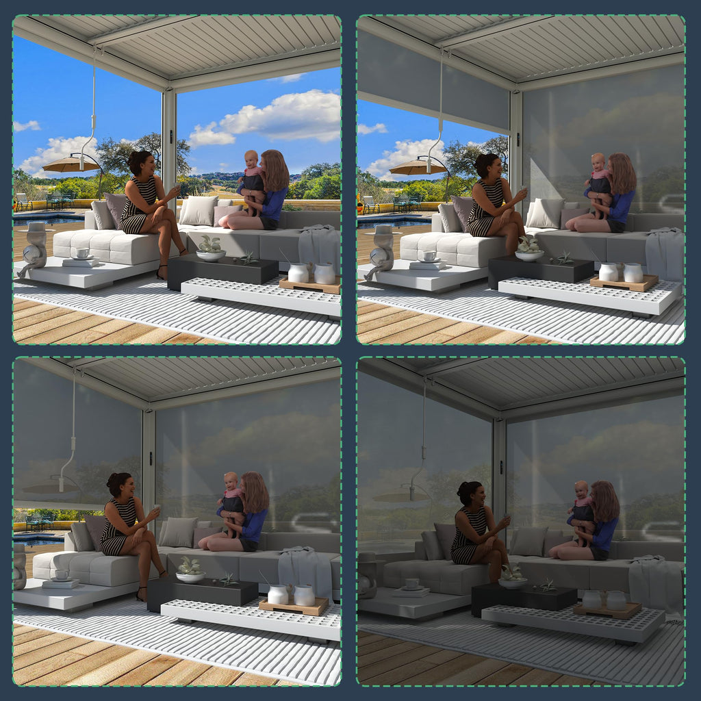 • SMART ELECTRIC CONTROL: With the integrated post and remote controller for this electric pergola, you can control the opening and closing of the motorized roof, the 4 pull-down screens, and the LED lighting—all with the touch of a button, providing maximum comfort and convenience. The screens offer excellent weather resistance against wind, rain, and sunlight, while also enhancing privacy, with the option for independent or simultaneous control of each screen.