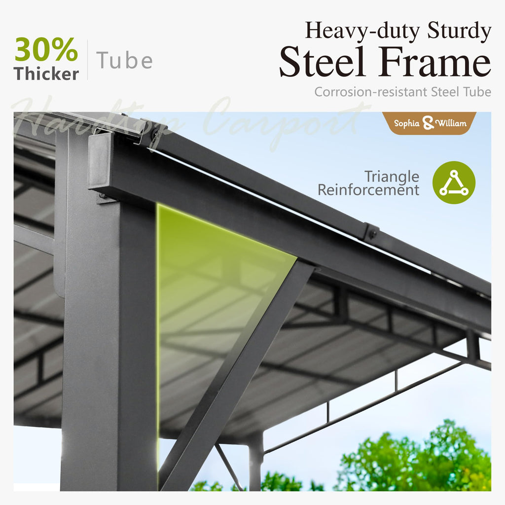 - Premium Metal Carport: Thickened galvanized metal roof has strong snow bearing capacity: 10 PSF, which is suitable for year-round outdoor use.We have matching seam taped for connection part of each roof panel to prevent water leaking