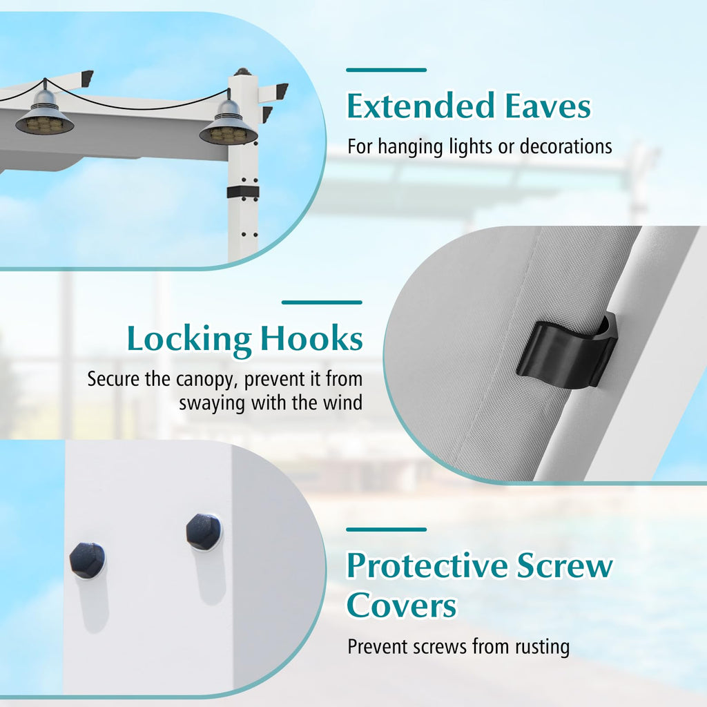 - Retractable Sun Shade Canopy: The patio pergola is equipped with a retractable canopy, which could meet different needs of full shade, partial sunlight, or open sky views. There are 10 pulleys for smooth sliding, a rope loop for easy pulling. When fully opened, it features locking hook to secure the canopy, prevent the canopy from swaying with the wind.