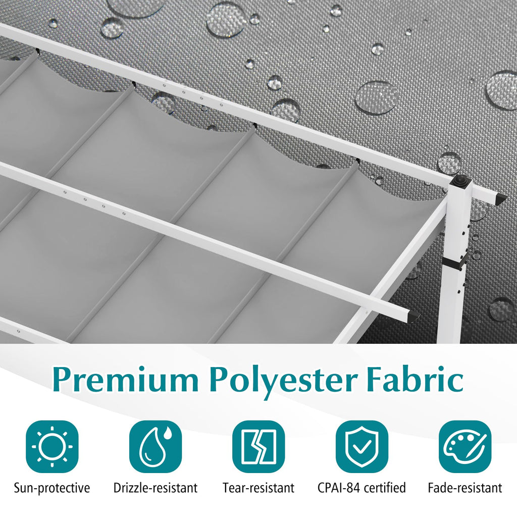 Our 10 x 12 ft pergola provides a 120 sq.ft large footprint, which is ideal for enjoying outdoor entertainment with your family and friends. In particular, the canopy can be easily retracted or unfolded by smoothly rolling pulleys and a rope loop, thus it could create an ideal level of shade and protection as weather conditions change. And the CPAI-84 canopy is crafted of flame-resistant and weatherproof polyester fabric, providing added safety and longevity. Thanks to its thick aluminum columns and 4 corner reinforced plates, this pavilion provides unparalleled durability and stability. With its unique and elegant appearance, this pergola could also add a touch of charm and style to your outdoor living space.