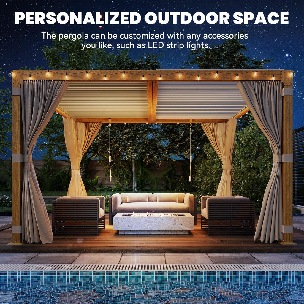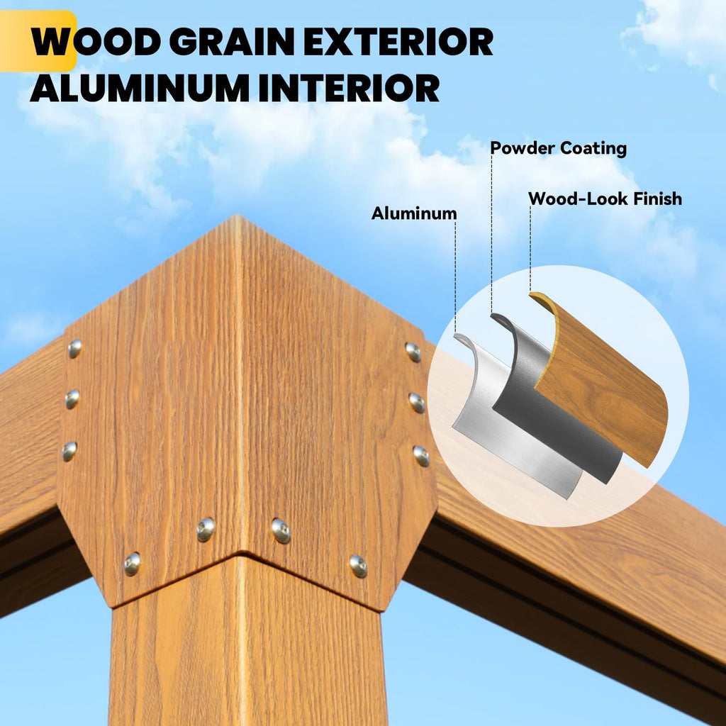 - Nature-Inspired Durability: Our pergola combines realistic wood-grain finishes (heat-transfer printed) with rust-proof aluminum construction, blending seamlessly into outdoor patio. Unlike wood, it resists cracking, rot, and UV fade—zero maintenance required. All-weather engineered to withstand rain, snow, and humidity without warping. Enjoy lasting beauty and structural integrity for decades.