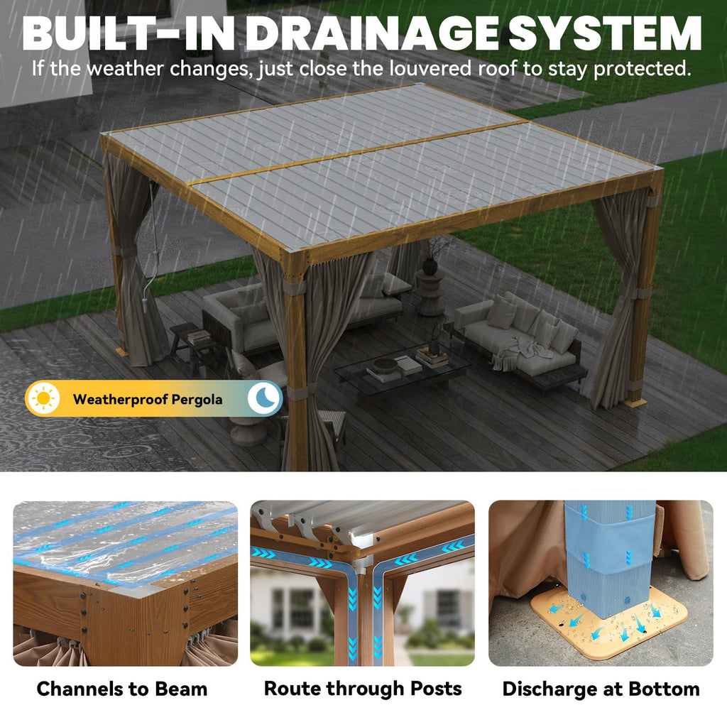 - All-Weather Protection: The overlapping louvers, along with built-in gutters, provide superior waterproofing, keeping the area beneath dry. The legs and beams of the outdoor pergola louvered channel rainwater from the roof through the beams and out the posts, ensuring uninterrupted outdoor gatherings