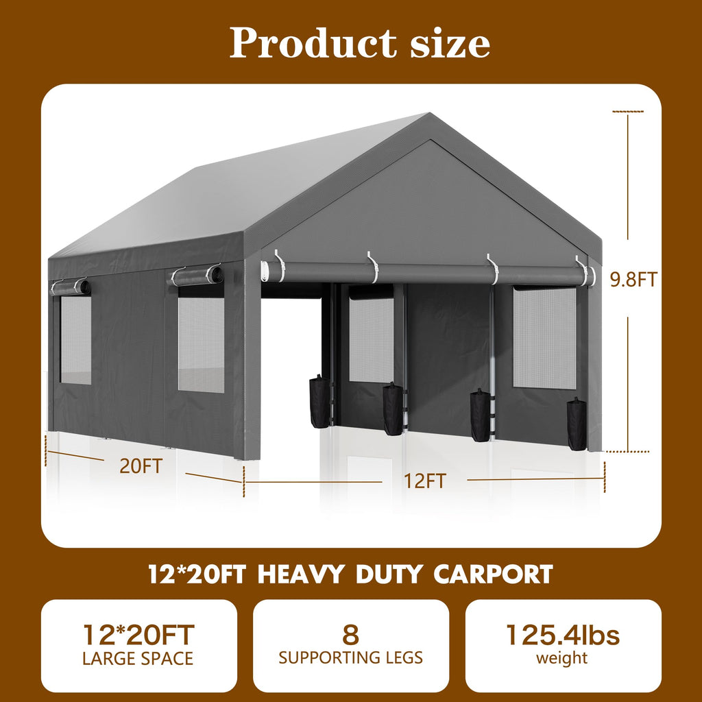 - 【Large Portable Garage】The 12x20 ft carport canopy heavy-duty provides ample space for your vehicles, boats, cargo, etc. Removable sidewalls and doors can meet your various needs. The carport canopy shelter is perfect for parties, commercial exhibitions, outdoor events, weddings, storage shelters, and so on.