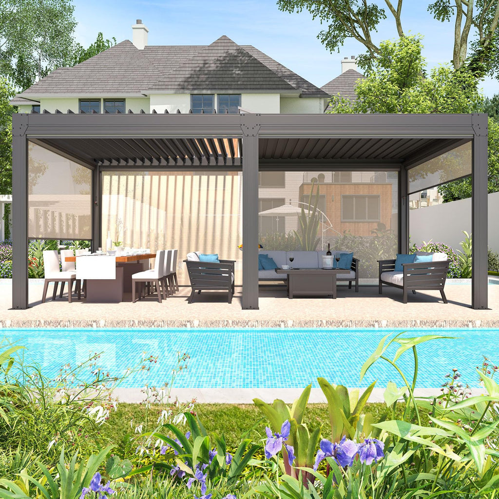 - DELUXE ALL-SEASON SCREENS: This adjustable louvered pergola is equipped with versatile pull-down screens that surround the pergola, offering protection from sideways wind, rain, and sunlight. The 6 screen panels allow natural light to filter through while ensuring privacy and shielding you from harmful UV rays, and creating a barrier against mosquitoes and other pests. Adjust the screens height effortlessly