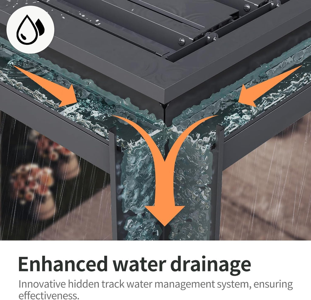 - VERSATILE SHADE: This adjustable hardtop pergola provides shelter from sun and rain with its removable curtains and netting that can cover the entire structure as needed