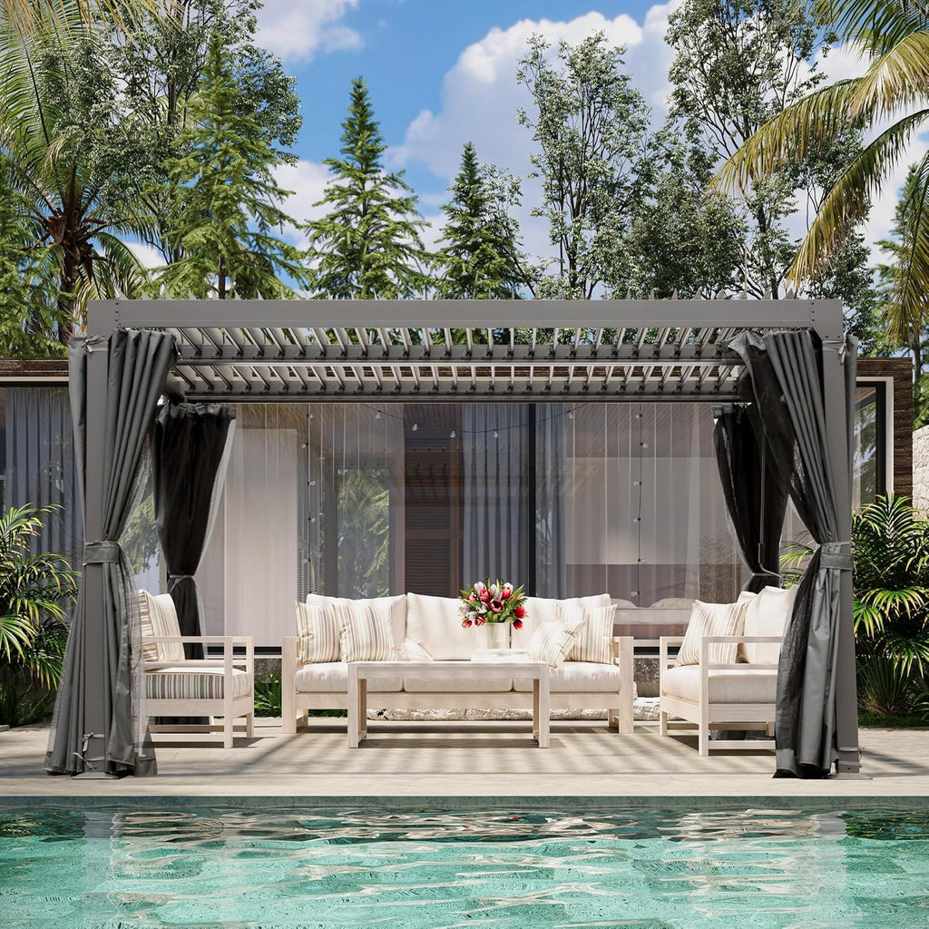 Details: 10' × 10' Louvered Pergola, Outdoor Aluminium Canopy with Adjustable Roof Curtains and Netting for Patio, Deck, Garden, Yard, Beach.