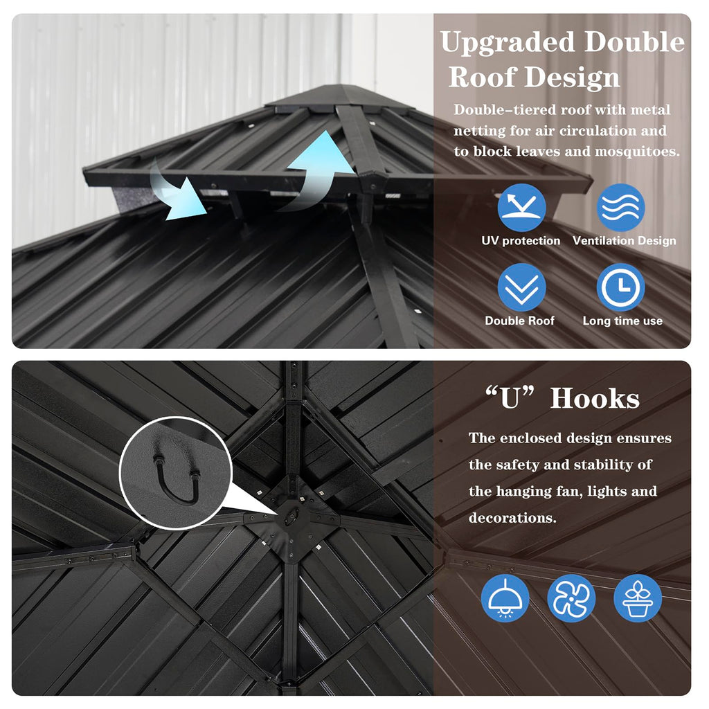 - 【Double Top Design】The roof of this gazebo are consist of galvanized steel and polycarbonate panels. This combination ensures a long-lasting structure and double top offers excellent air circulation. The Insect net is included that can keep out mosquitoes or insects.