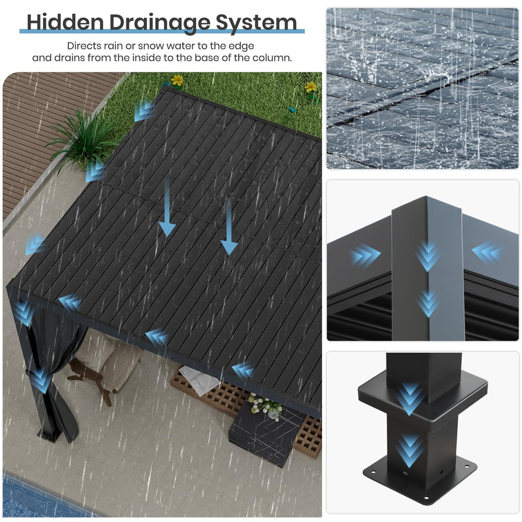 - Hidden Fast Dry Drainage System: Our outdoor pergola has a built-in gutter system along the roof, and rainwater will be diverted to the columns and avoid water accumulation on the roof and keeping dry underneath, so no worry about rainy or snowy days.