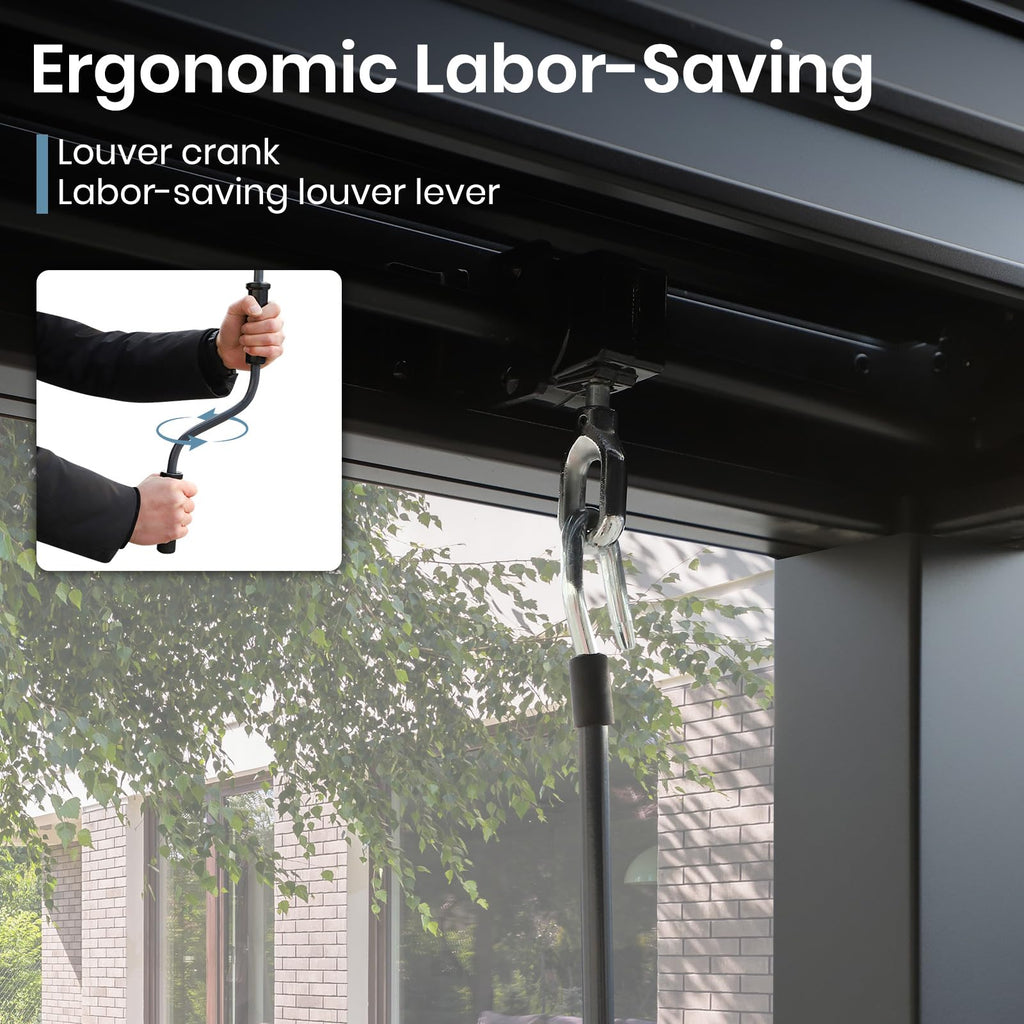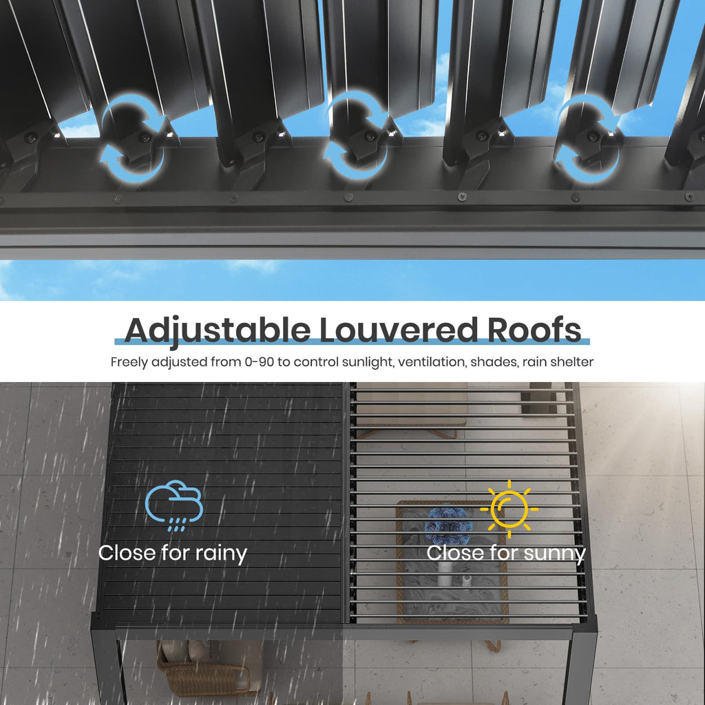 - Independent Adjustable Louvered: The independent louvered roof design of this aluminum pergola allows you to adjust the angle effortlessly from 0° to 90° to obtain the amount of sun or shade you receive. Besides, it is also a great shelter from the rain when closed completely