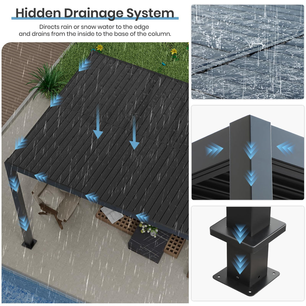- Hidden Fast Dry Drainage System: Our outdoor pergola has a built-in gutter system along the roof, and rainwater will be diverted to the columns and avoid water accumulation on the roof and keeping dry underneath, so no worry about rainy or snowy days