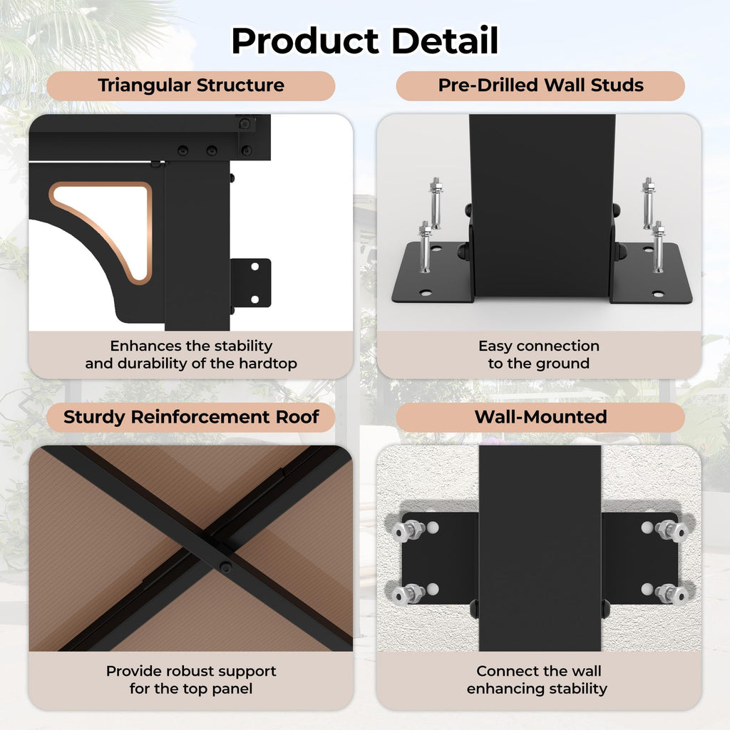 Details: 10'x 10'Wall Mounted Gazebo, Hardtop Lean-to Pergola with Polycarbonate Roof