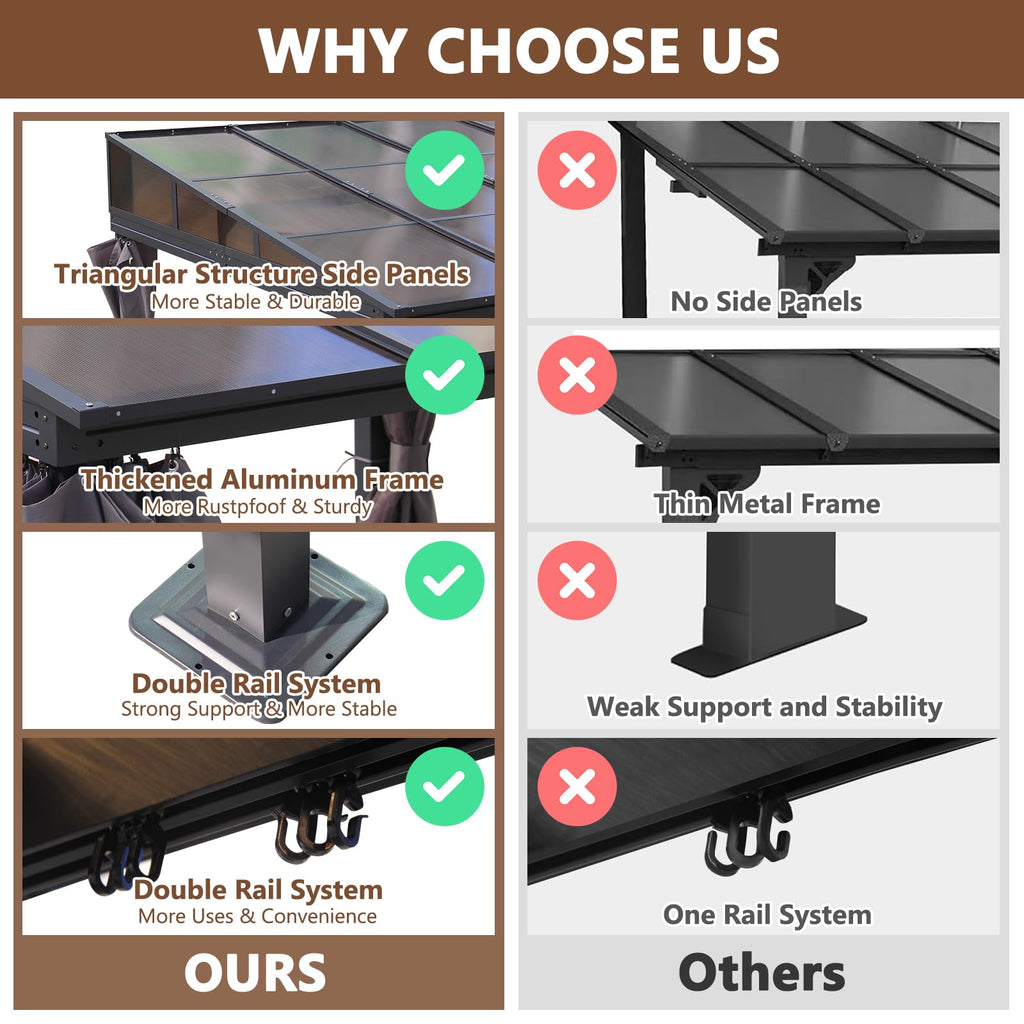 - Netting & Privacy Curtains - The hardtop gazebo is designed with double-sided zippers, double rail system, and double sidewalls fully enclosed. In the summer netting can be used to resist mosquito bites while keeping cool and ventilated; ensures good ventilation and open views. In winter, close the curtains, and you will get a warm private space; fully enclosed shell protects you from rain and UV rays while adding more privacy.