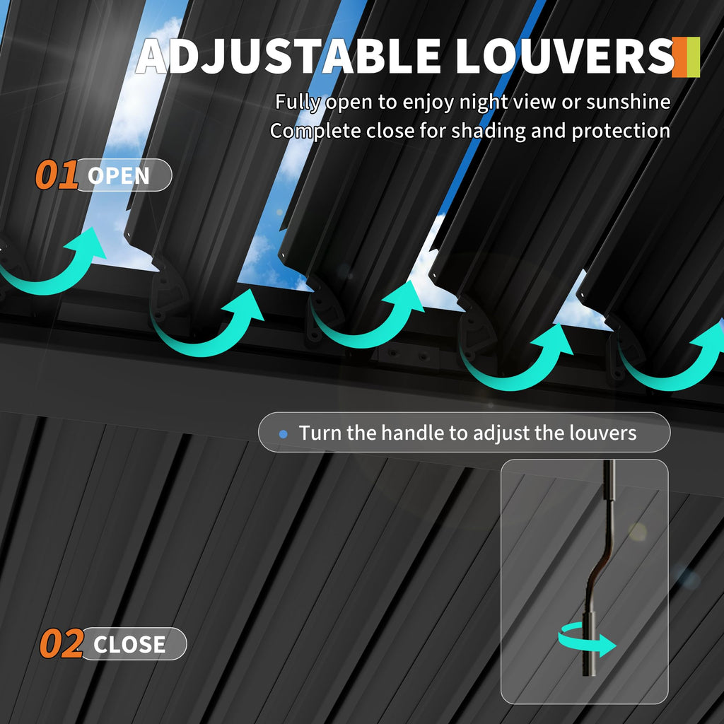 - ADJUSTABLE LOUVERED ROOF - Just a turn of the handle on the louvered pergola allows for precise control of sunlight and ventilation. The 0° - 90° angle adjustment adapts to rain, sun, or wind, making it perfect for year round outdoor living. With two rows of individually controlled louvered roofs, you can still bask in the sun or gaze at the stars with this patio pergola