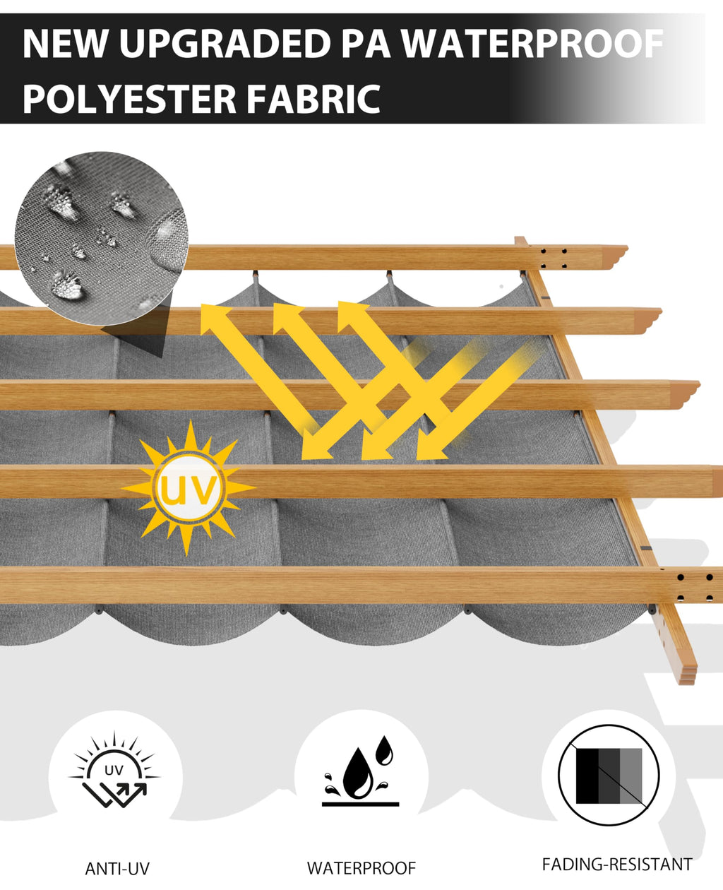 - Retractable Outdoor Canopy: This product features a built-in sliding track design that allows you to easily move the canopy to customize the shaded area as needed. The canopy is made of polyester fabric, offering waterproof and sun protection properties to effectively block UV rays. Note: It is not recommended to use the canopy in extreme weather conditions such as strong winds or heavy rain