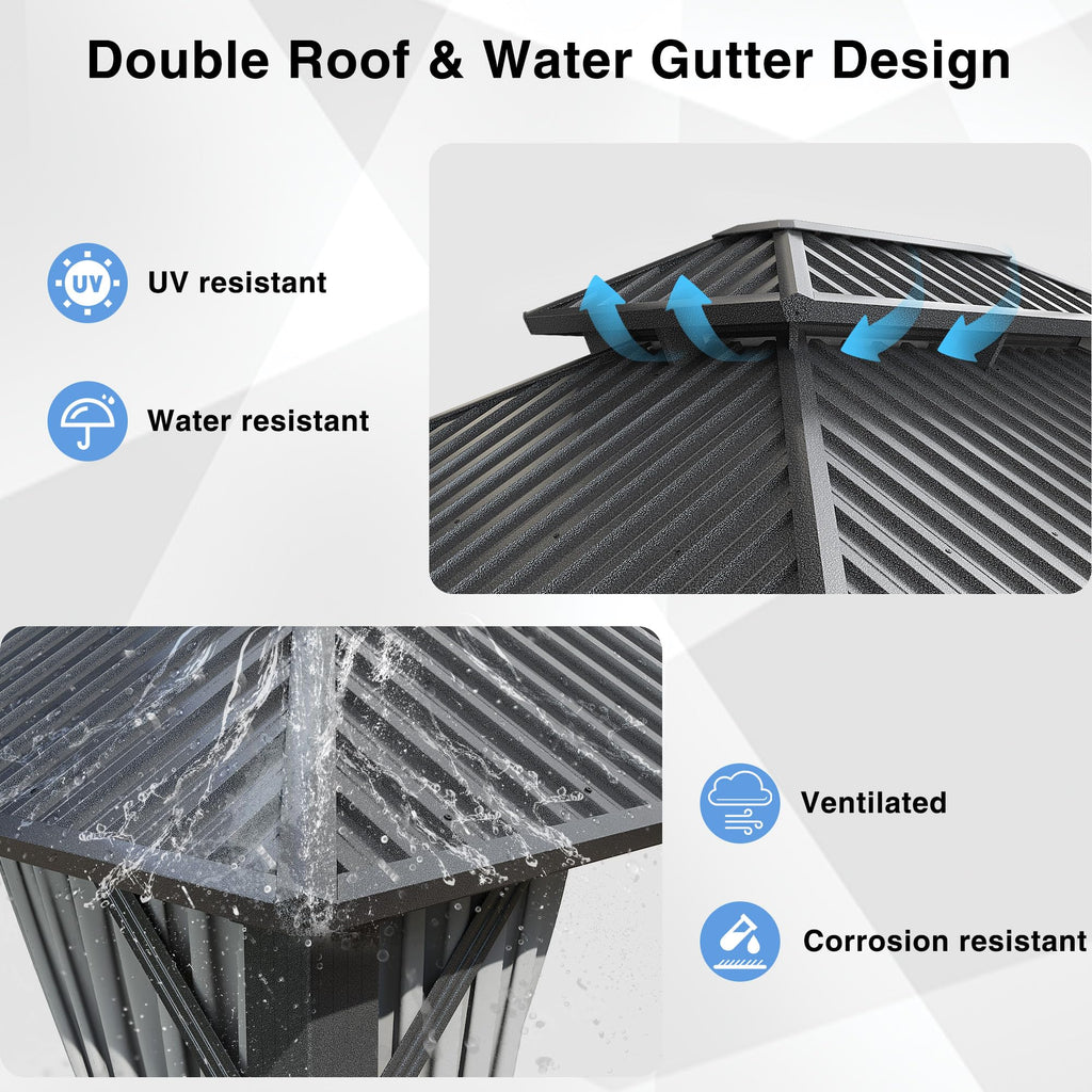 - [DOUBLE-TIER GALVANIZED IRON ROOF] The Airwire gazebo features a double-layered, galvanized iron top patio covers for shade and rain, offers superior protection against fading and enhances durability. Pergola 2-tier vented roof promotes airflow and heat dissipation, even during windy conditions. The gazebo 10x12 roof center includes two sturdy hook for hanging electric lights or fans, elevating your outdoor experience