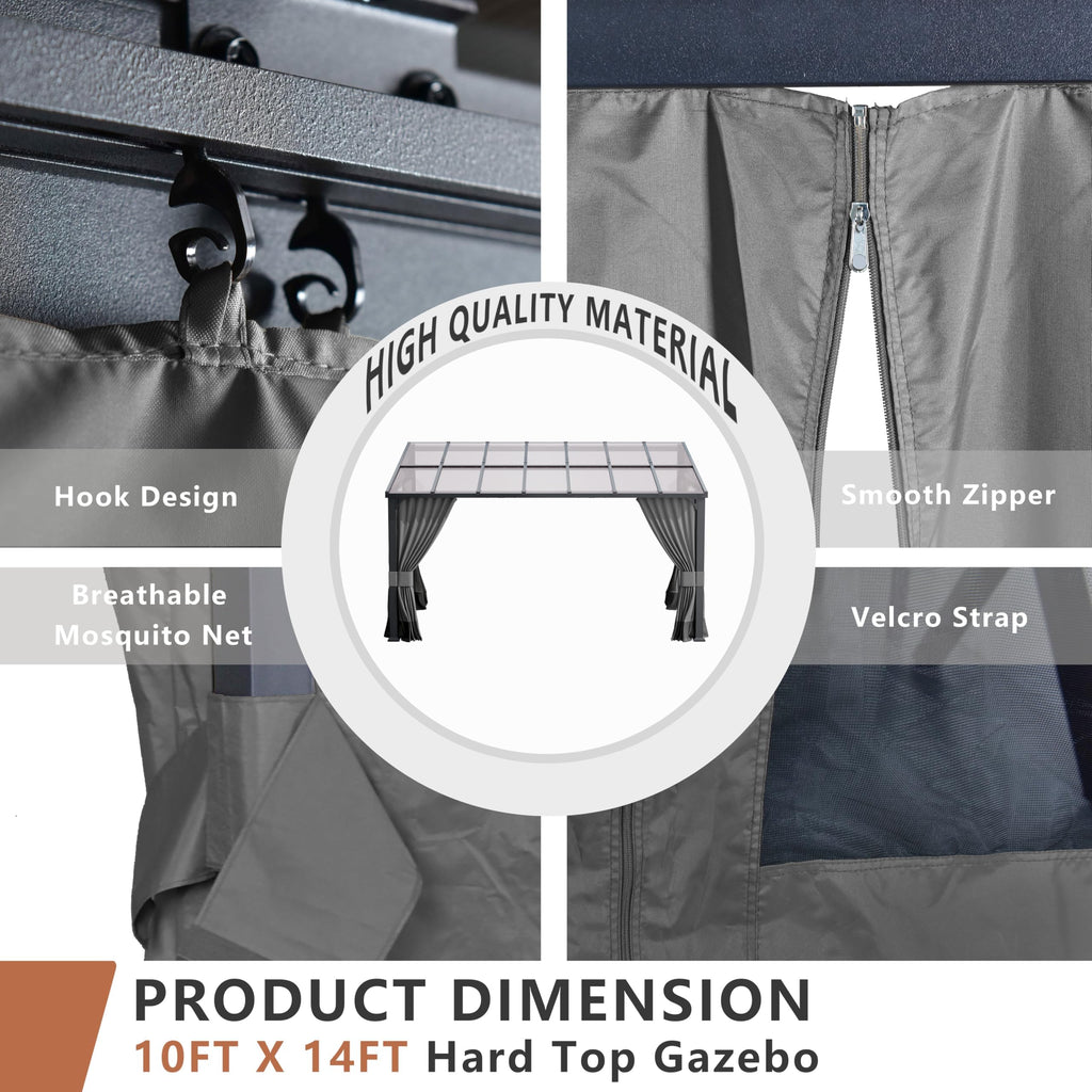 - Spacious Entertaining Space: With its spacious dimensions of 10 Ft. x 14 Ft. this gazebo provides plenty of comfortable space for your family and guests. Perfect for family dinners, celebrations or casual gatherings, it provides a welcoming environment for shared time and fun parties.