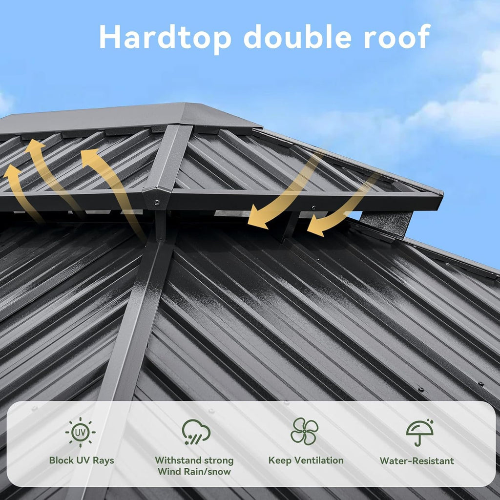 - 【Double Top in Galvanized Steel】Equipped with double roof, this patio gazebo provides effective heat insulation and ventilation, resulting in a cooling effect underneath the pavilion, creating a healthy and airy space. Featuring with the galvanized steel top, this product is rust-resistant, fade-resistant, durable and sturdy enough to withstand heavy weathers such as snow and wind.The double-roof structure adds visual interest and creates a stylish look for outdoor spaces.