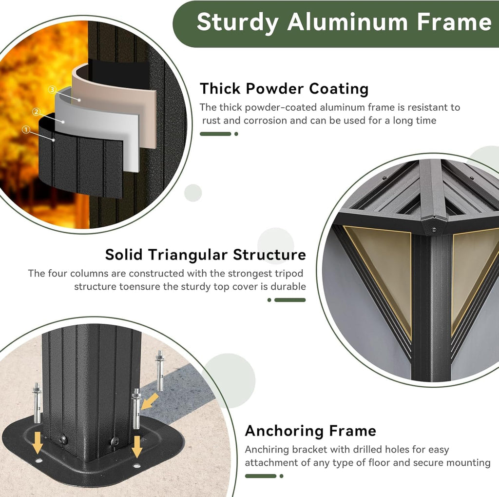 - 【Sturdy Frame】The thick powder-coated aluminum frame has strong load-bearing capacity, more wind resistance, and can protect you from the influence of sunlight and bad weather in all seasons. At the same time, 4 ground piles and expansion screws add extra durability and safety to our aluminum pavilion. Note:Maximum Wind resistant grade:7(31-38mph)