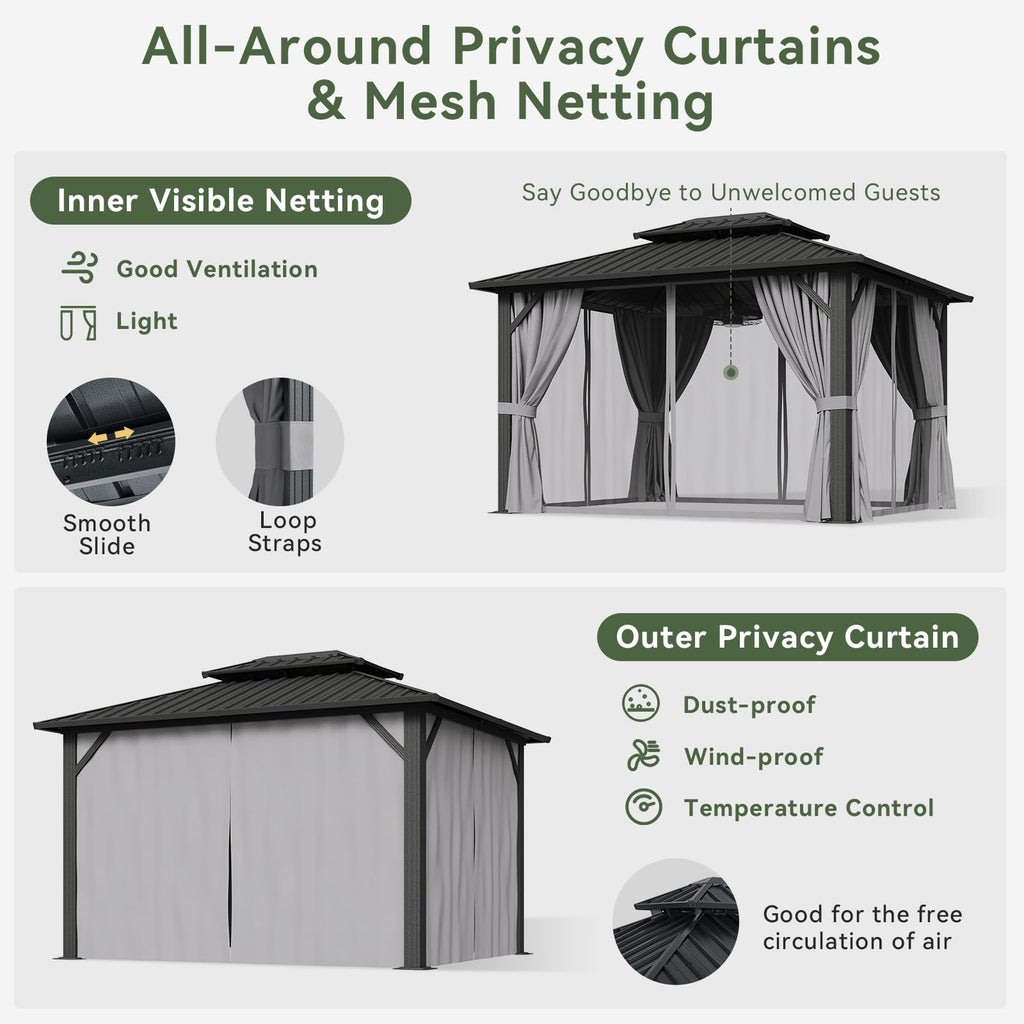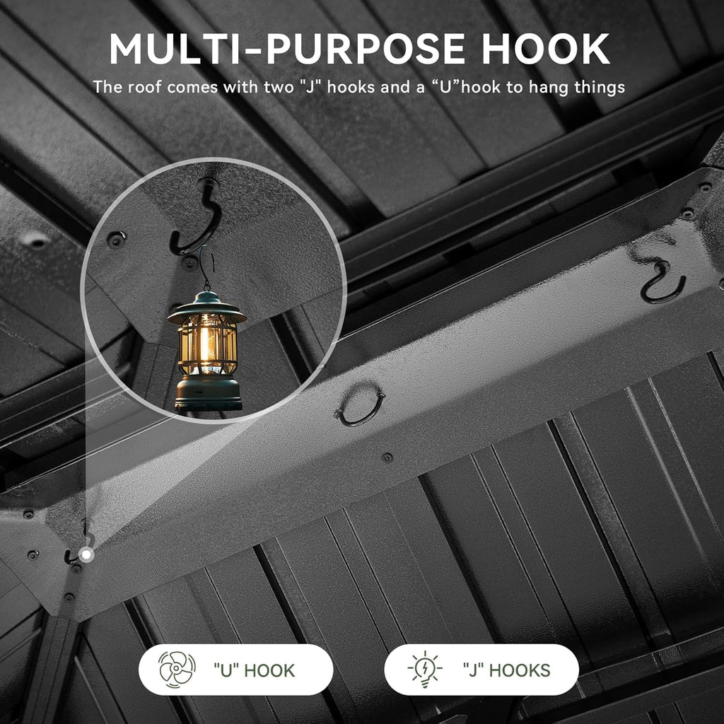 - 【Versatile and Useful】 Measured in 10' L X 12' W x 9.6' H, the hardtop gazebo covering 120 square feet offers ample room for various recreational activities. It is so versatile that it can be used as an outdoor dining area, a gathering spot for social events, or a relaxing space for lounging and enjoying nature, which can be also utilized as a parking shed for your car.