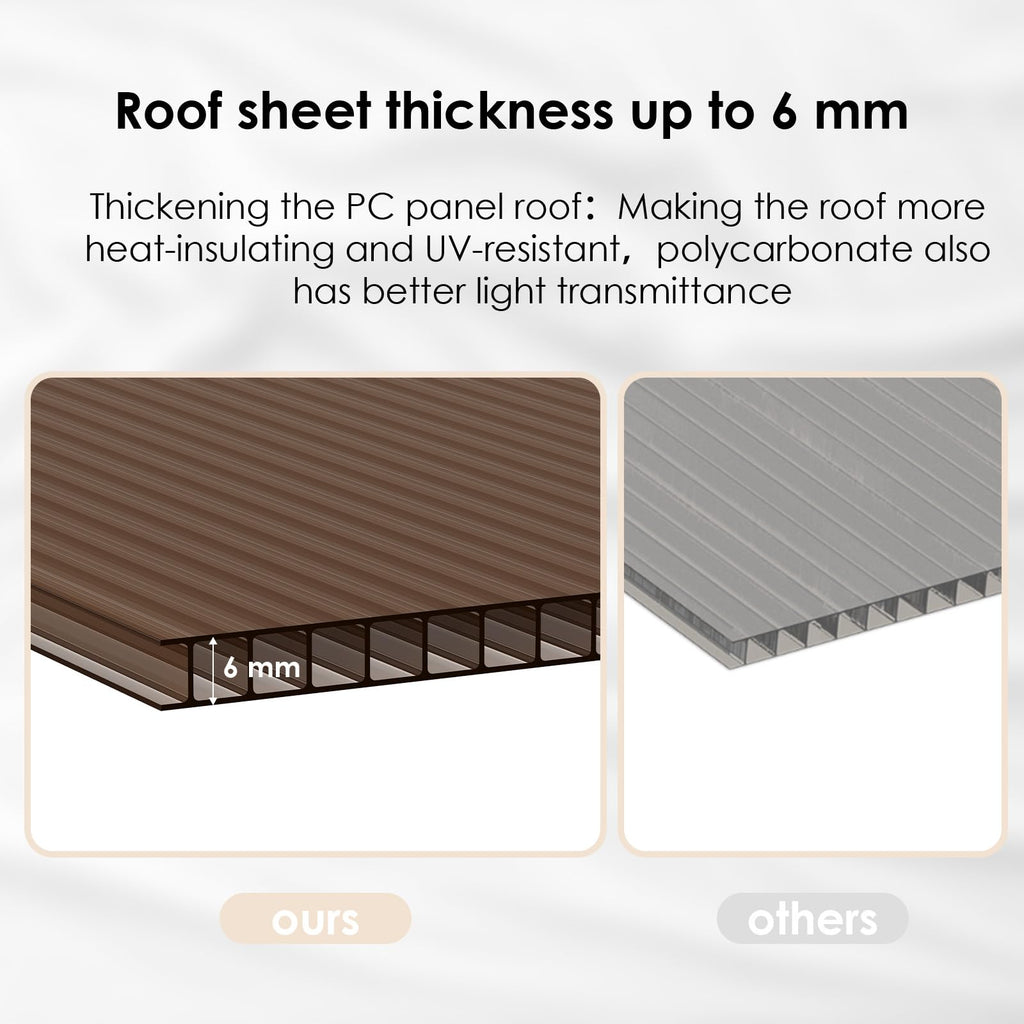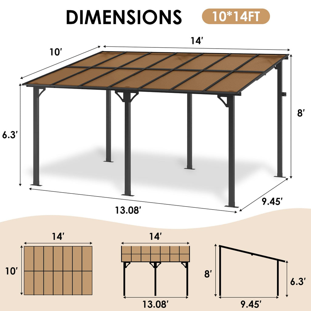 - Good shelter: Sturdy roof of the lean to gazebo is made of polycarbonate panels, which can block harmful ultraviolet rays while transmitting light, keeping you and your outdoor furniture away from the sun. Sloped roof design can drain water quickly and effectively block rainwater from entering the outdoor pergolas, allowing you to enjoy a leisurely afternoon tea even in the rain