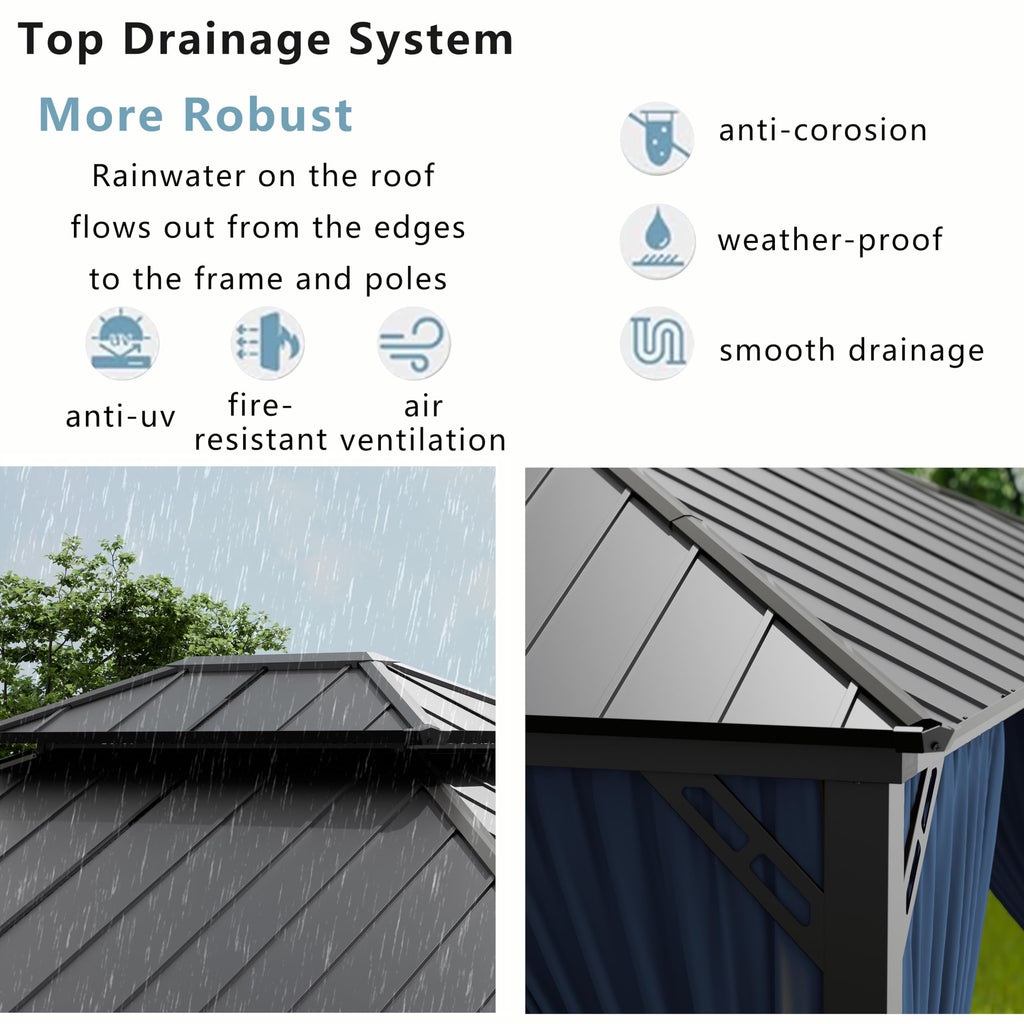 - Double decker roof design: Our hardtop gazebo adopts a double decker roof design, which helps with ventilation and cooling,there is also a slit drainage function at the top,make the rainwater run off the eaves smoothly and easily.