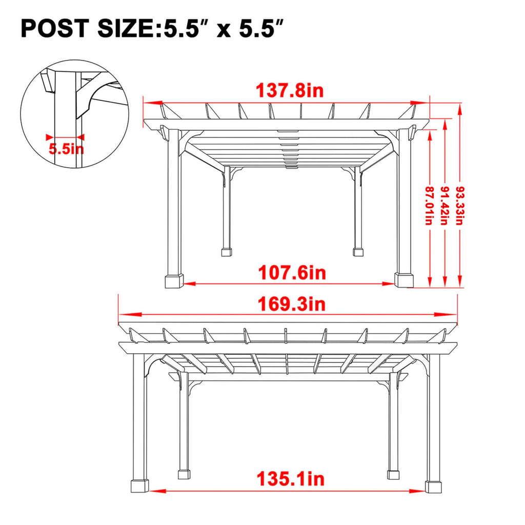 - DIMENSIONS - Overall size: 169.3"W x 137.8"D x 93.33"H; Post size: 5.5"W x 5.5"H; Interior size: 135.1"W x 107.6"D x 87.01"H. Please confirm that the installation is allowed in your area before purchasing