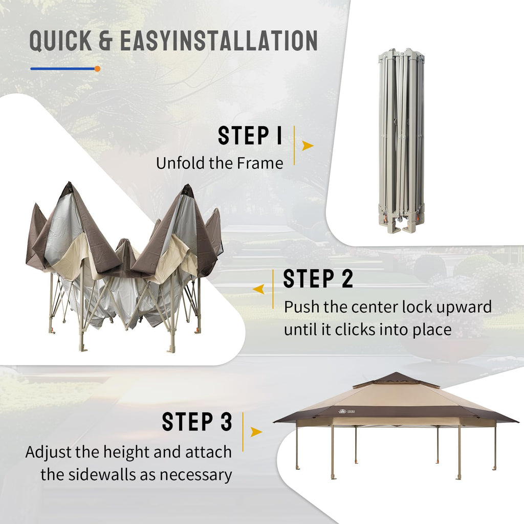 • EASIEST SET UP - Patented one push center lock technology – central hub locks out all six legs with a single push. Then use the soft pinch-free buttons to set the leg height. Next generation canopy designed so two people can set it up in seconds with no tools necessary