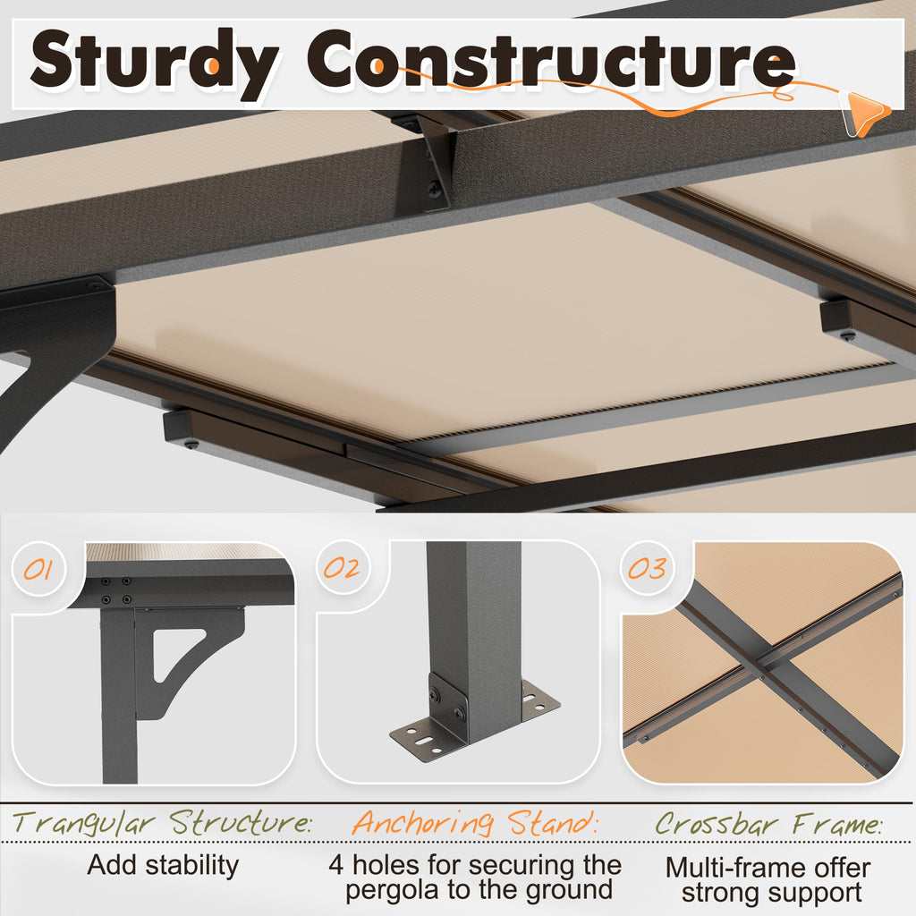 Constructed with 6mm polycarbonate hollow panels and a sturdy metal frame, the roof provides shade and rain protection while retaining warmth for comfort Versatile for courtyards, terraces, poolsides, or patios, this gazebo offers shade and shelter.