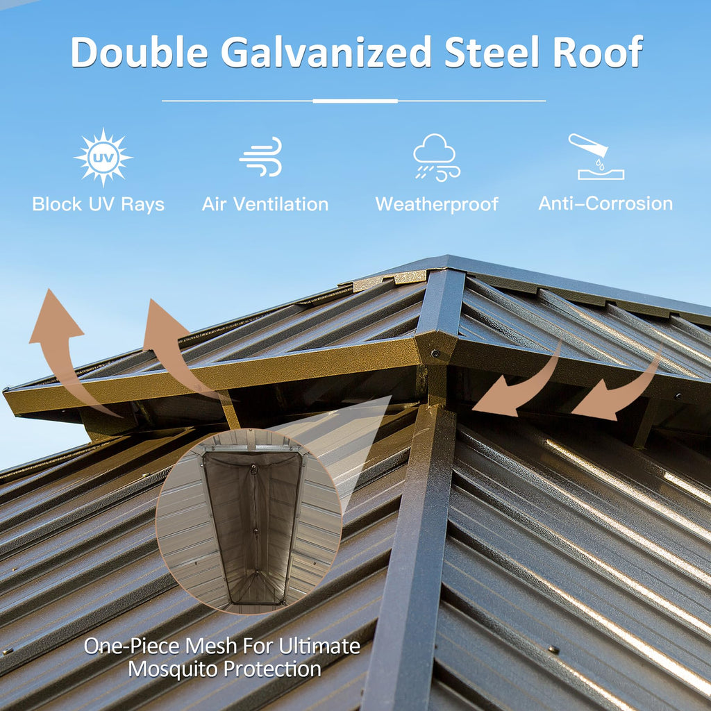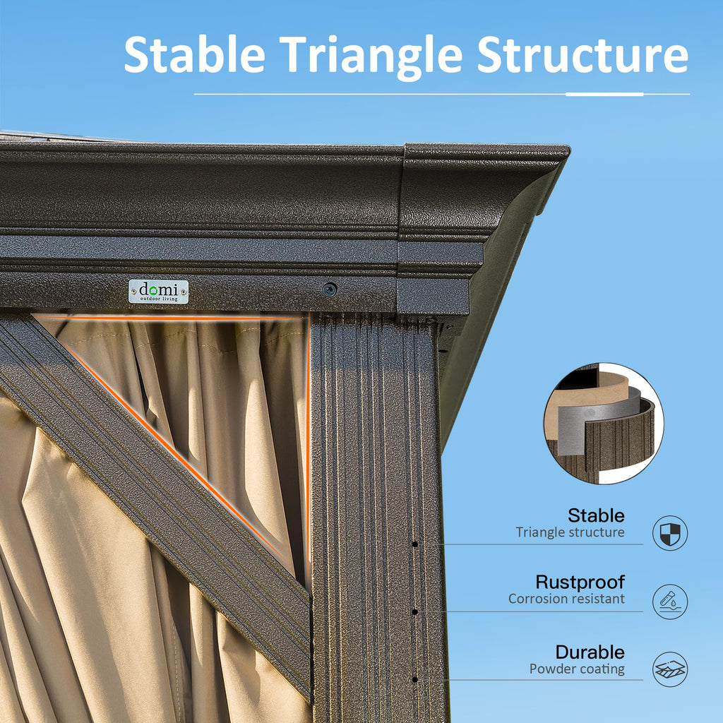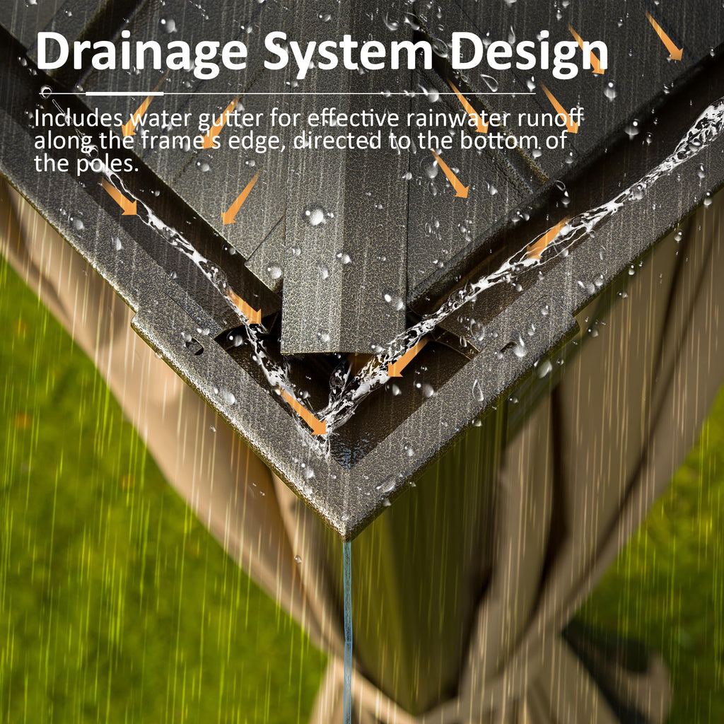 - [Built-in Drainage System for a Dry, Comfortable Space] The Domi metal gazebo features an innovative built-in drainage system that channels rainwater away, keeping your space dry and comfortable, even during rainy days. No more interruptions from rainfall—enjoy uninterrupted outdoor relaxation and entertainment all year long.