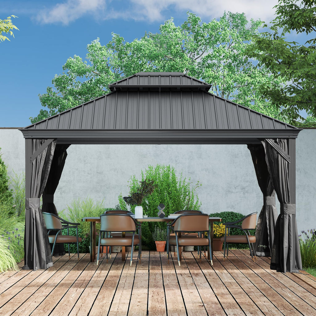 Domi 10x12FT Outdoor Gazebo, Hardtop Gazebo with Galvanized Steel Double Roof, Metal Gazebos with Drainage System Patio Pergola for Patio Deck Backyard,Curtain and Netting,Gray
