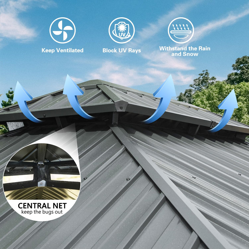 - Durable Hardtop Design: Built with a powder-coated galvanized steel roof, the Domi 10’x14’ hardtop gazebo is rust-resistant and designed to withstand harsh weather conditions, offering reliable protection year-round