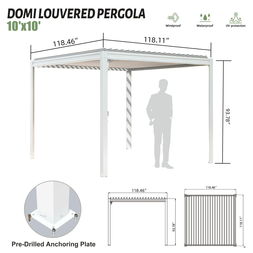 Domi Louvered Pergola 10X10FT, Aluminum Pergola with Adjustable Louvered Roof and Drainage Gutter, Outdoor Pergola Gazebo for Patio, Backyard, Deck, White